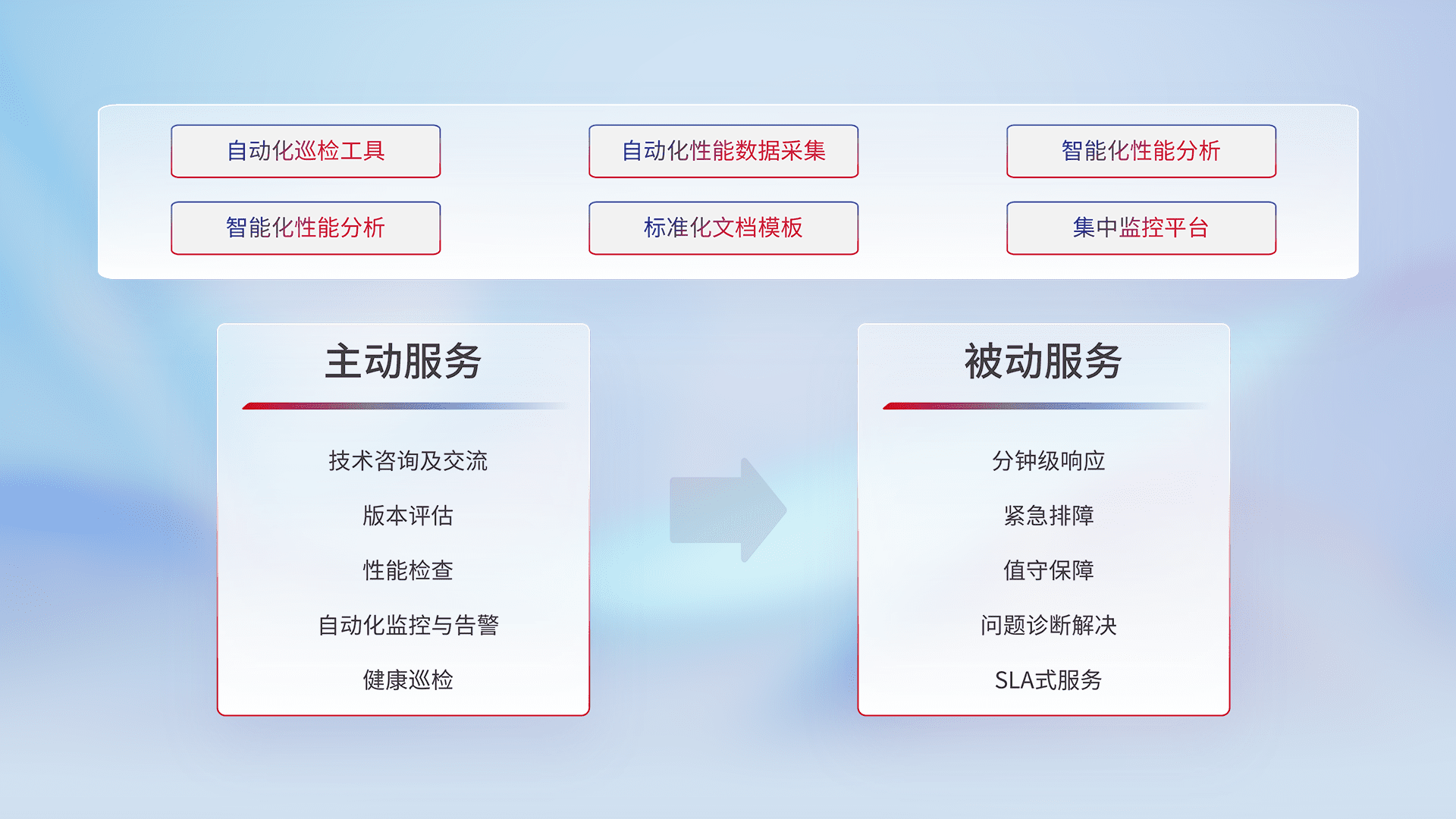 智能化工具和标准化文档,,,,保障服务质量,,提供主动服务(包含技术咨询、、、版本评估、、性能检查、、自动化监控与告警、、、、健康巡检)和被动服务包含(分钟级响应、、、紧急排障、、、值守保障、、、、问题诊断解决、、SLA服务)。。